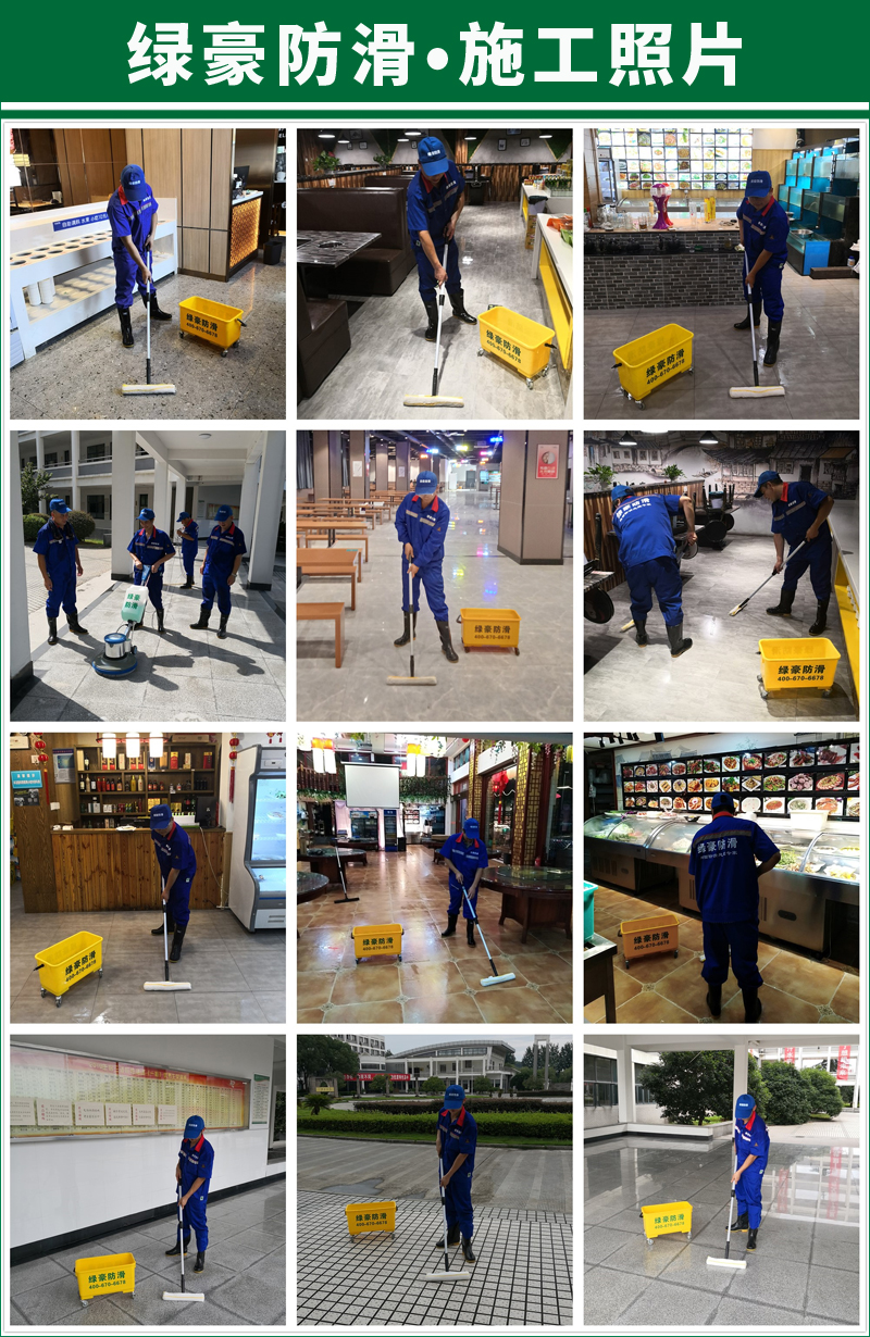 綠豪防滑劑能有效的滲入瓷磚的毛細孔內,使毛細孔變粗,在表面形成很多細小肉眼看不見的納米級凹槽,地面摩擦系數大大增加,防滑處理后表面不增加涂層,打掃衛生無影響。