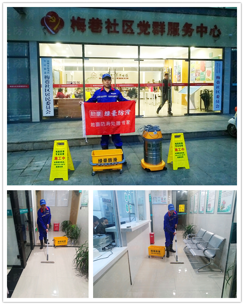 梅巷社區服務中心地面防滑處理案例,綠豪地面防滑是地面防滑處理專業品牌(4006706678),主要針對瓷磚防滑處理、地面防滑處理、飯店防滑處理、學校防滑處理、醫院防滑處理,具有中國環境治理甲級資質,中國防滑行業最具影響力品牌,集科研、生產、銷售、服務于一體,依托浙江大學科技園技術支持,致力于人居環境安全服務,專業地面防滑處理,杭州電視臺有專題報道,《錢江晚報》有新聞報道,浙江政府采購云平臺供應商,阿里巴巴地面防滑服務商。